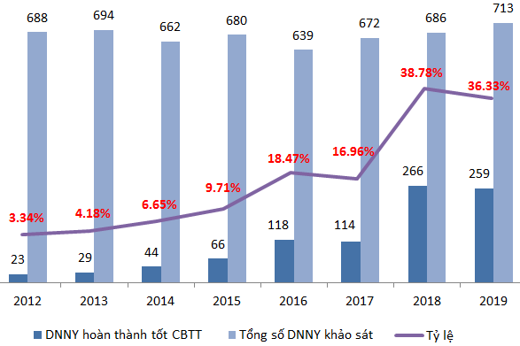Qua đồ thị trên có thể thấy, tổng số DNNY được khảo sát năm 2019 tăng 27 doanh nghiệp so với năm 2018. Tuy nhiên, số lượng DNNY đạt chuẩn CBTT lại giảm 7 doanh nghiệp, tương ứng với tỷ lệ giảm 2.45%.